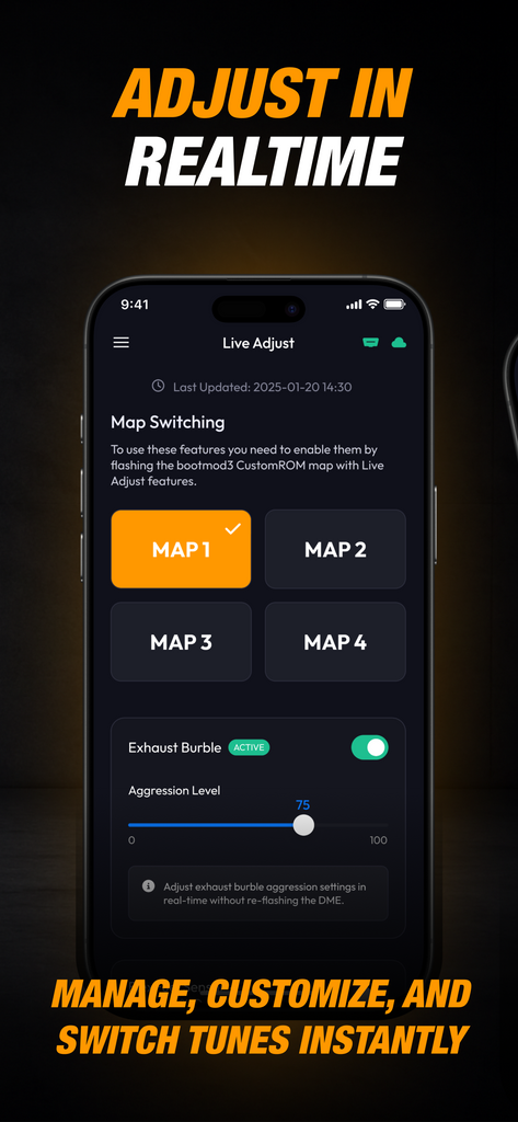 Build the ultimate tune for your S63tu powered vehicle and go from stock to full race calibration, and everywhere in between, with a map switch in the provided mobile app. bootmod3 calibrates the factory vehicle modules over the OBD port in a matter of minutes in the convenience of your driveway or anywhere internet access is available.